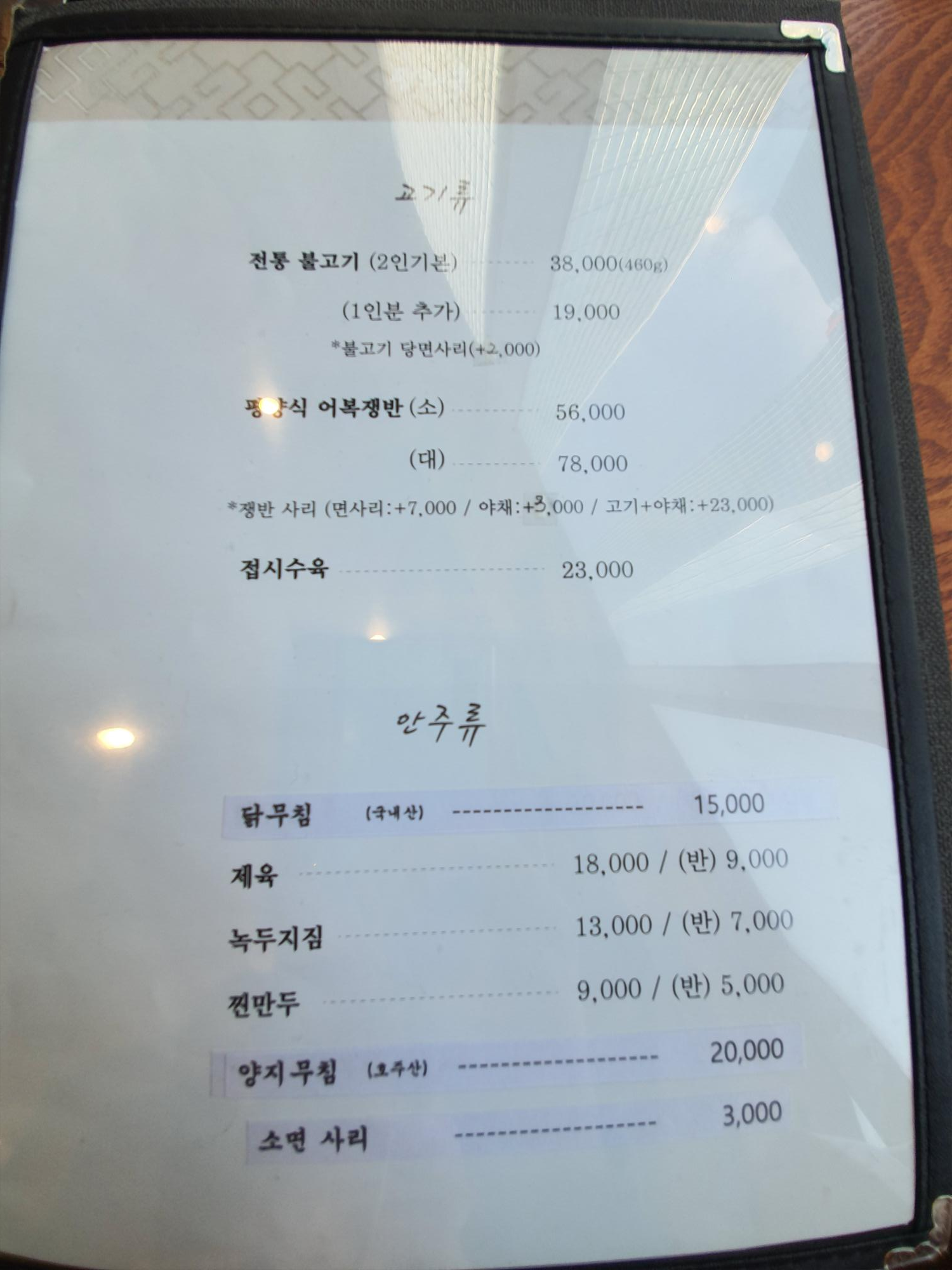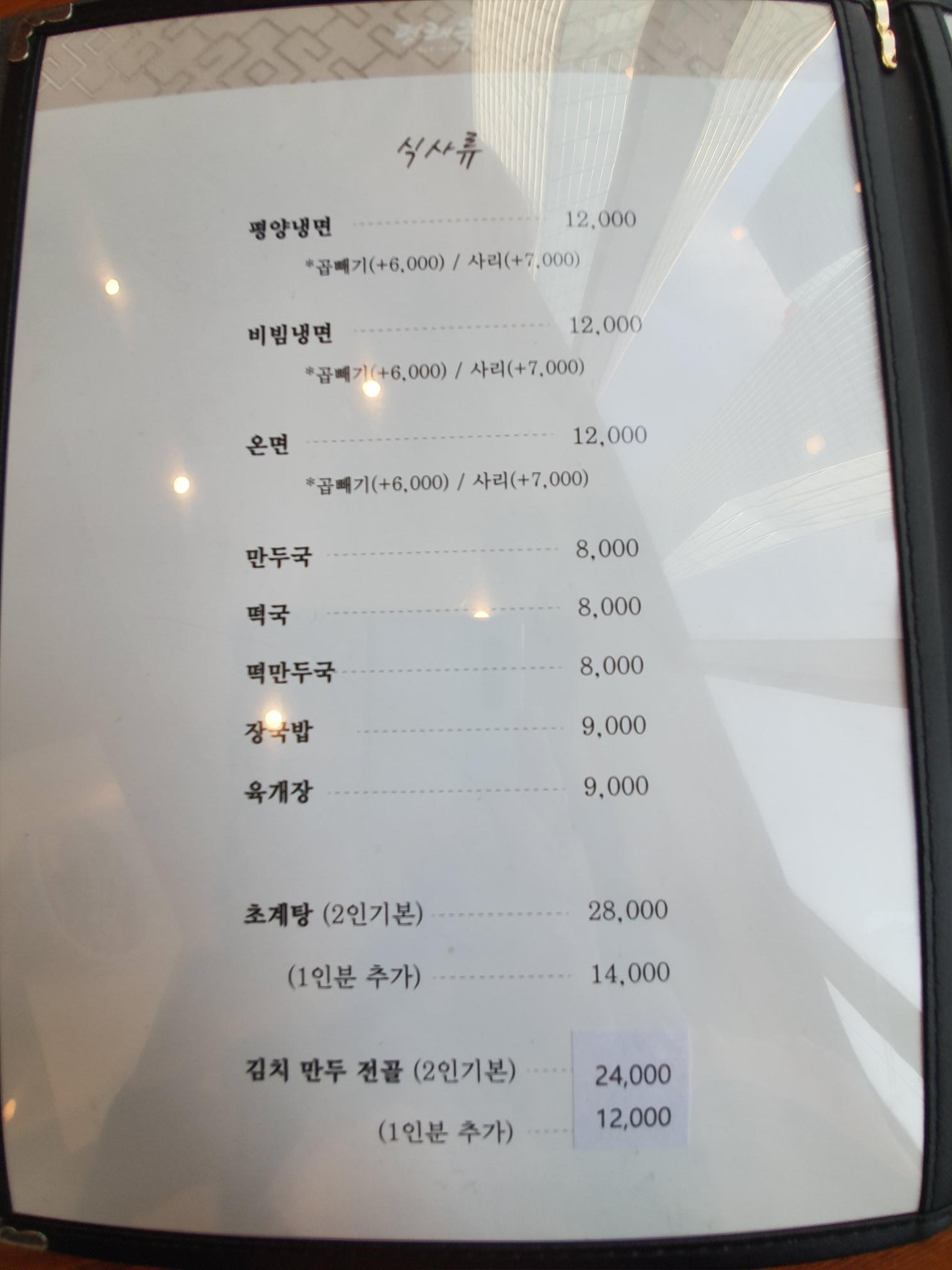메뉴들 참고하세요. 냉면은 물/비빔냉면 모두 12,000원입니다.