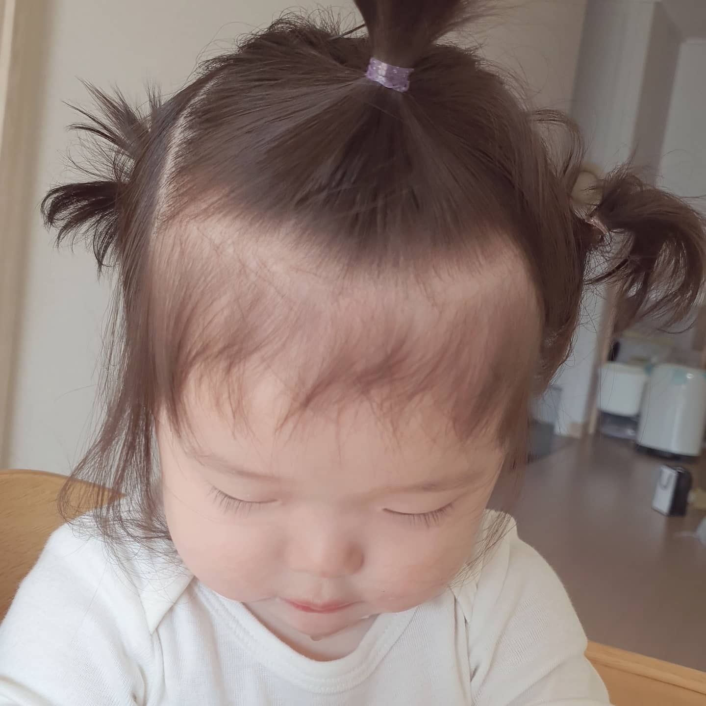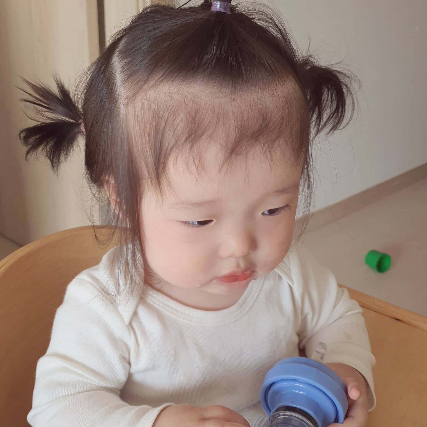 그냥 놔둘까 하다가, 너무 보기가 싫어서 아빠가 머리 묶기를 도전해봤습니다.