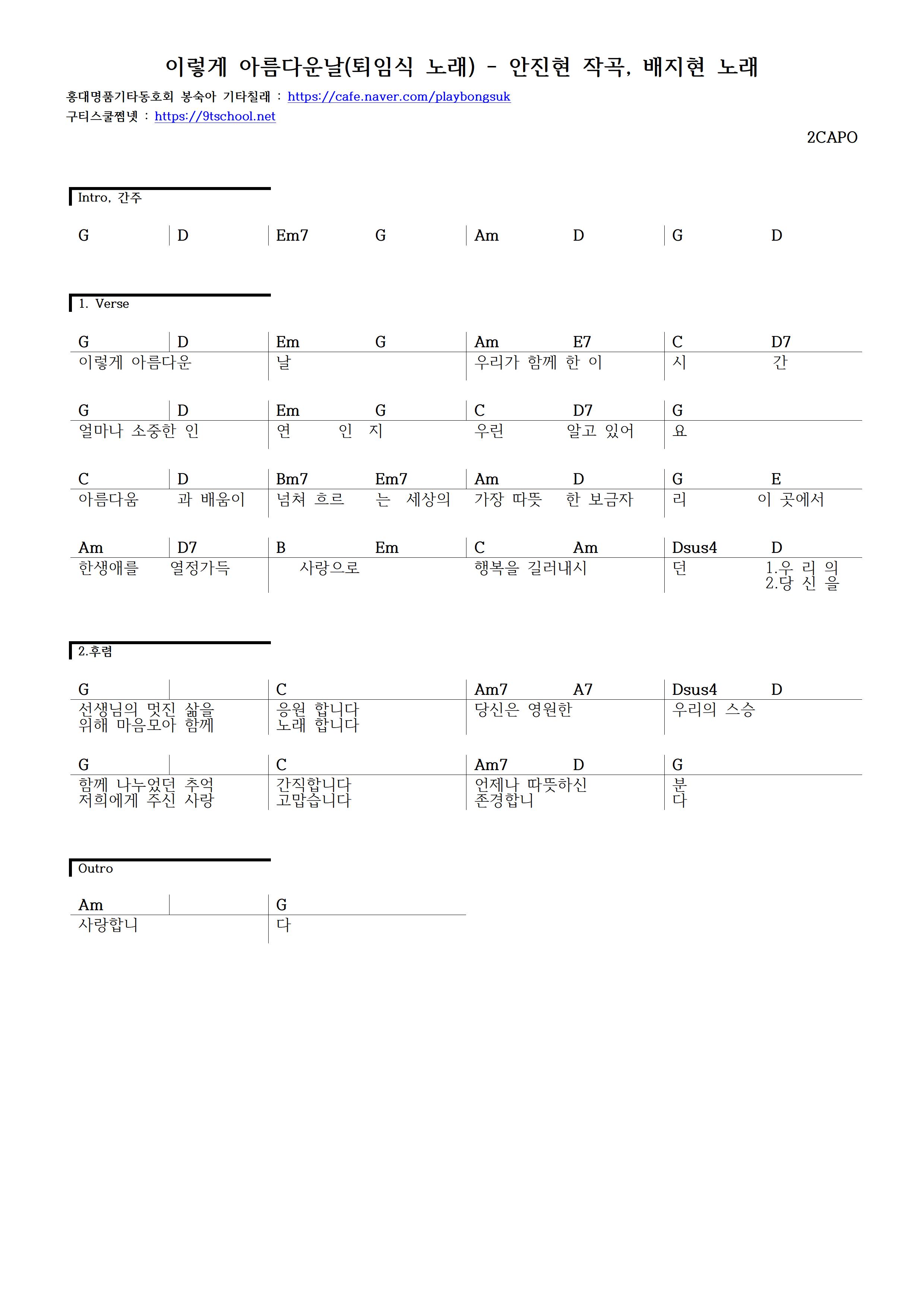 이렇게 아름다운 날(퇴임식 노래) 쉬운 기타 코드 악보Love My life/즐기는 인생♬ 2021. 7. 26. 11:18728x90