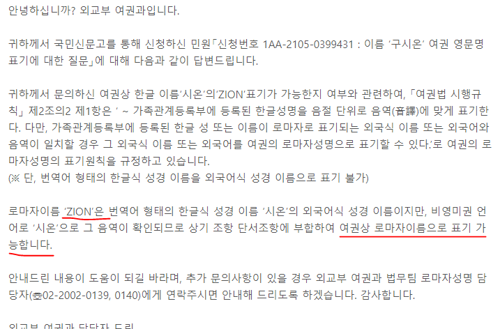아빠가 구씨라서 GUSION이 되면 부정적인 의미가 되므로 ZION으로 쓰는것을 허용할 수 있지 않을까하고 외교부에 질의를 했습니다.