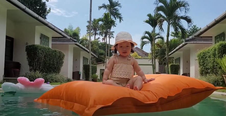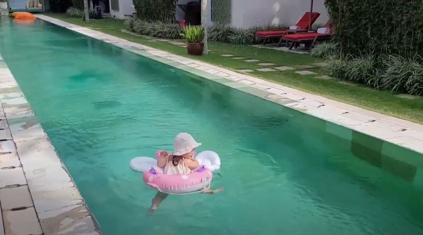 아침을 배달로 떼우고 난 뒤에 물을 좋아하는 따님을 수영장에 풀어줍니다.