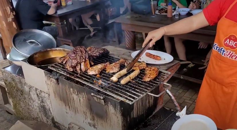 가게 문 앞에서 고기를 직접 굽고 있는데 냄새와 시각적 효과가 장난이 아닙니다.