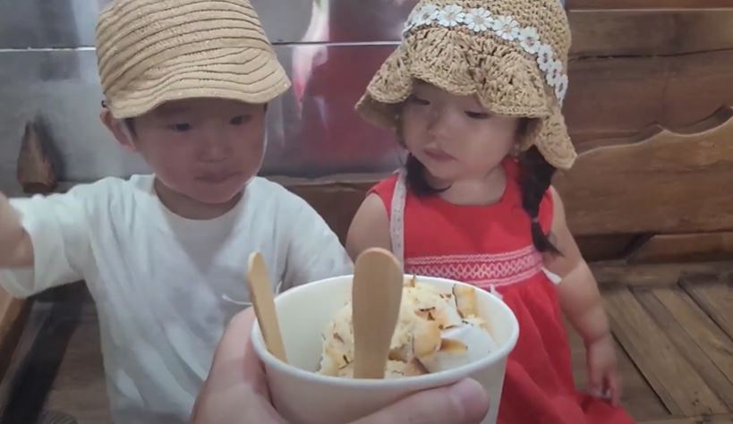 엄마가 티크 주방 목재에서 쇼핑을 하고 있을동안 아빠와 둥이들은 코코넛 아이스크림을 먹으러 왔습니다.