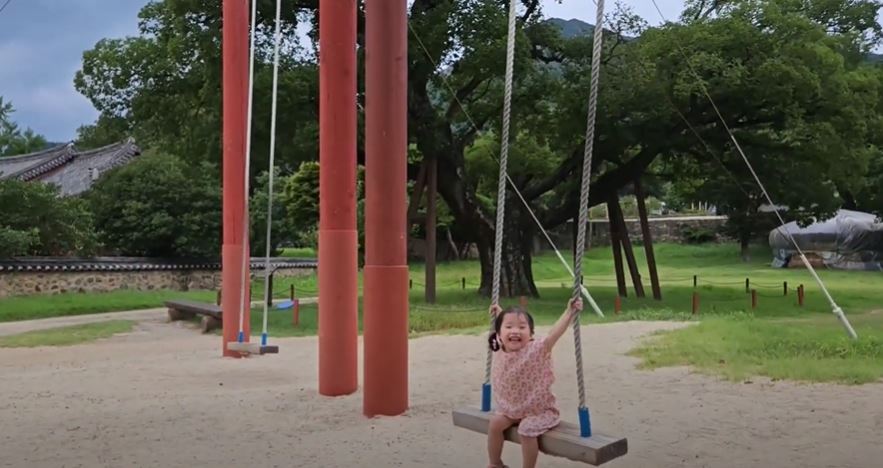우리 아가들은 더워도 땀 뻘뻘 흘리면서 아침부터 낙안읍성 내의 굴렁쇠 굴리기, 그네 타기를 즐기고 있습니다.