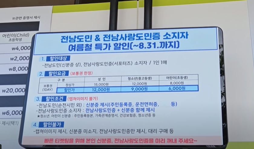 8월 31일까지에 한해 전남사랑도민증 소지자는 할인가 12,000원에 들어갈 수 있었습니다.